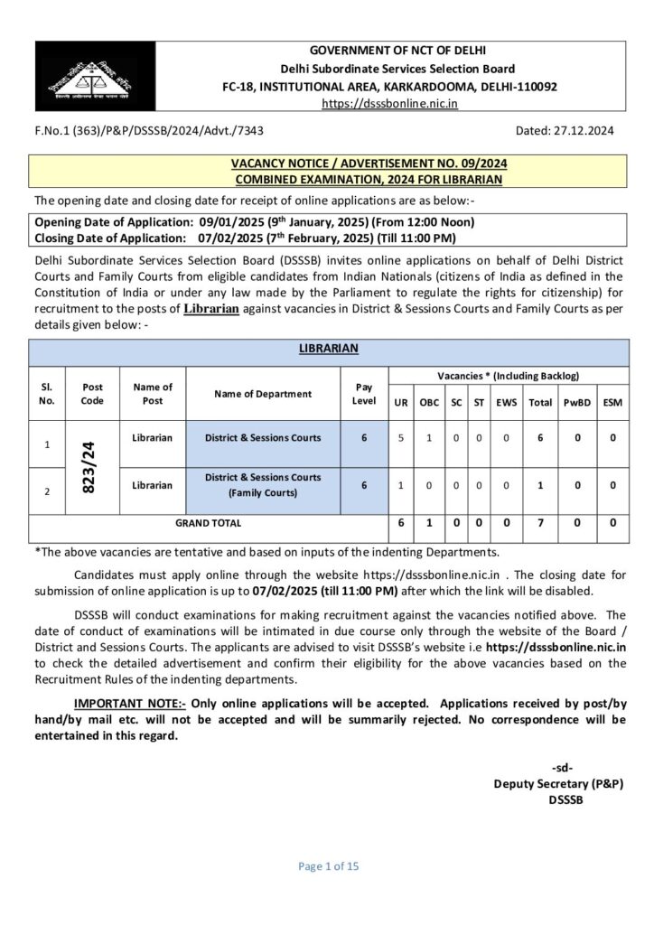 DSSSB Librarian Bharti: DSSSB भर्ती, के लिए आवेदन की तिथि दिनांक 09-01-2025 है।